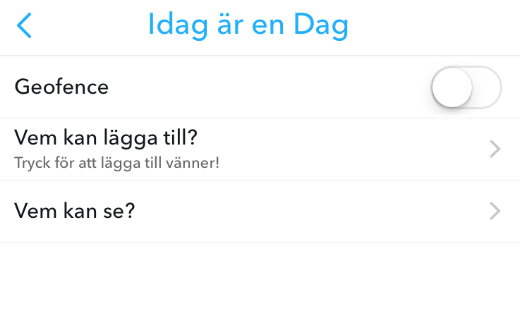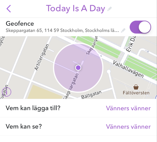 Här kan du döpa din story till något passande. Kanske FEZZZT! eller Bröllopsmys. Eller Idag är en Dag som vi så fint gjort här. Klicka inte i Geofence (det går vi igenom i nästa punkt och den funktionen är ännu bättre lämpad för en stor fest).