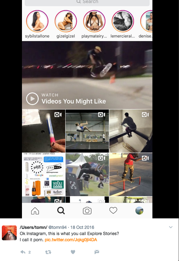 2016 berättade fler användare att "lättklädda" konton dök upp som förslag för flera användare, skriver sajten Campaign. Samma år rapporterade Daily Dot att personer har lagt upp porr på appen och använt kluriga hashtags för att fortfarande sprida sitt innehåll – och som ledde till att emojin "eggplant" försvann som hashtag…