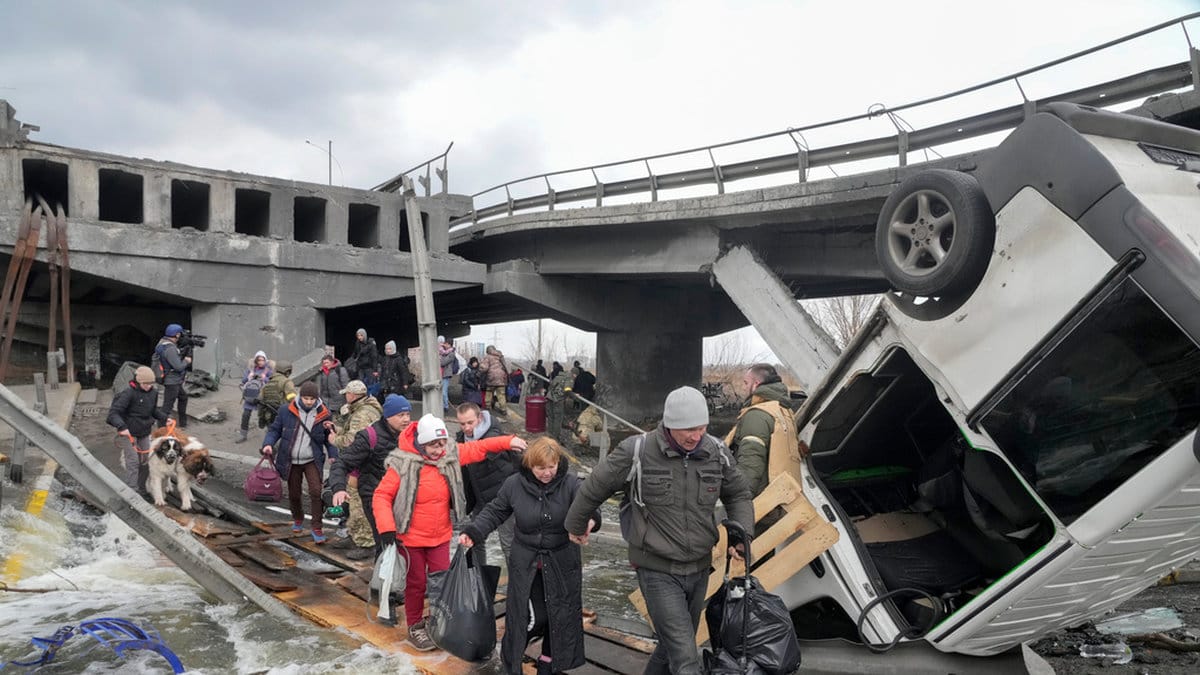 Familjer och andra mindre grupper från samhället Irpin tar sig med sitt bagage till fots över den skadade bron över floden, eller via provisoriska alternativ, på väg in till huvudstaden Kiev. Ofta har de hjälp av ukrainska soldater, men är oskyddade och riskerar att utsättas för rysk eld.