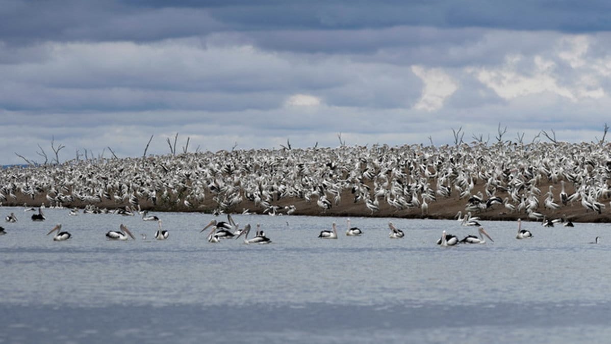 Kring sjön Cowal har fler än 30 000 pelikaner samlats i år för häckningsperioden och 15 000 bon trängs på landtungorna, som till följd av de höga vattennivåerna är som öar.
