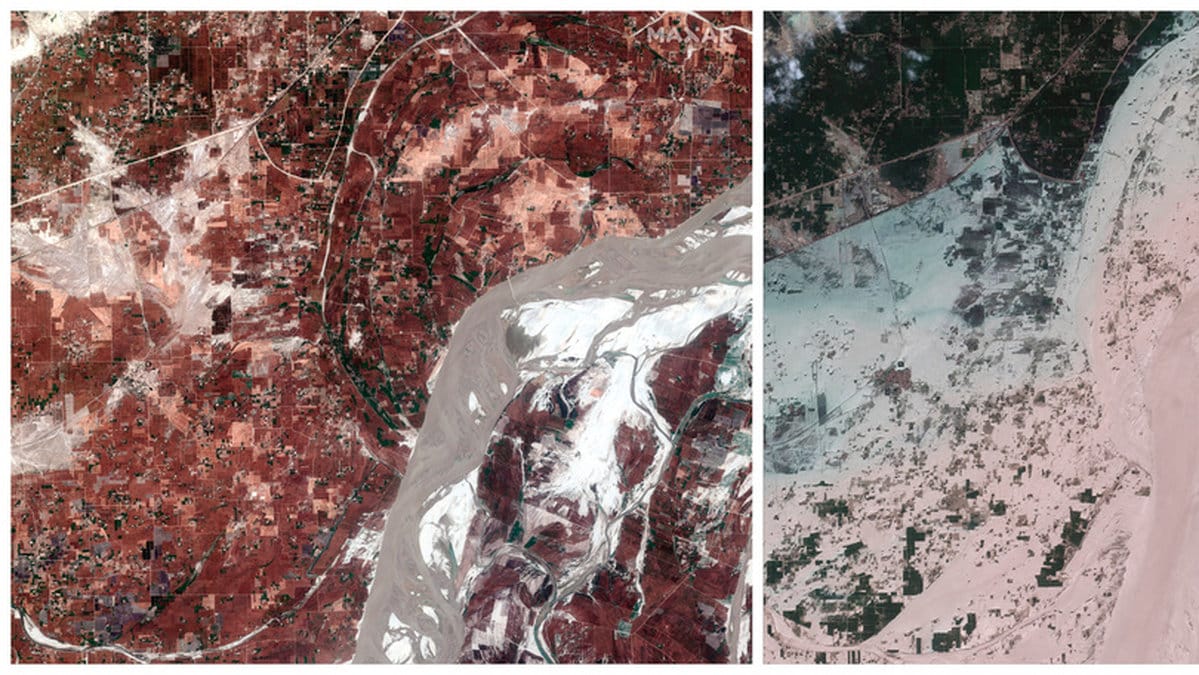 Satellitbilder före och efter översvämningarna som lamslagit Pakistan under sommaren visar hur byar, fält och infrastruktur ligger under vatten.