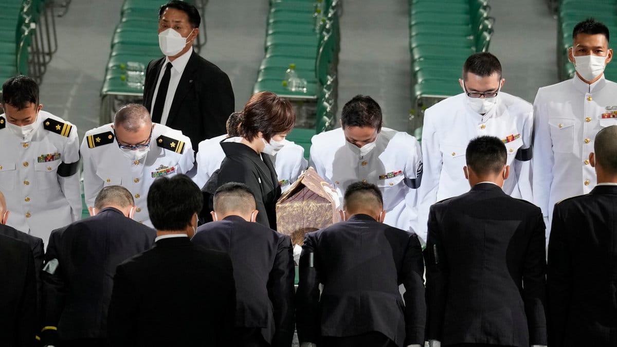 Abes aska bars in till Nippon Budokan, där ceremonin hölls, av hans änka Akie. Utanför samlades tusentals människor för att hedra den tidigare premiärministern.