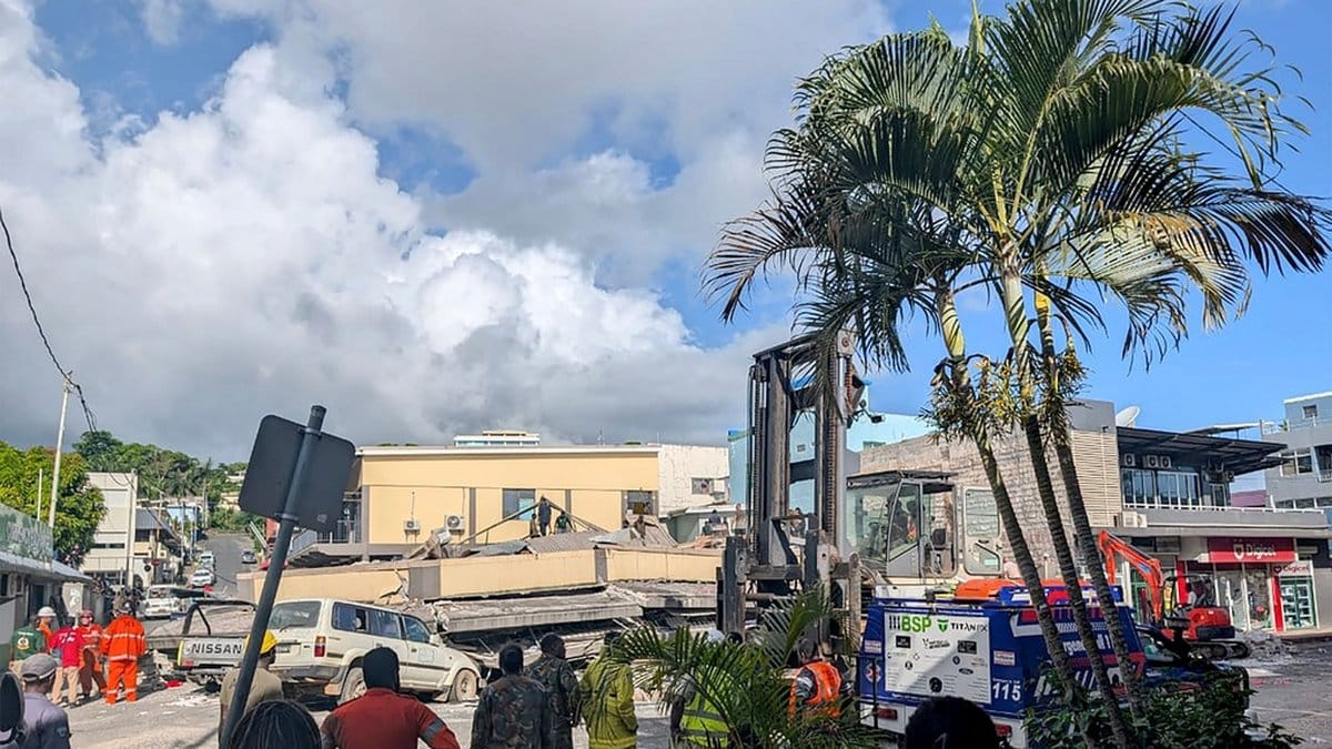 Rop på hjälp hördes fortfarande på onsdagsmorgonen, lokal tid, från rasmassorna av det som tidigare var ett trevåningshus i huvudstaden Port Vila.