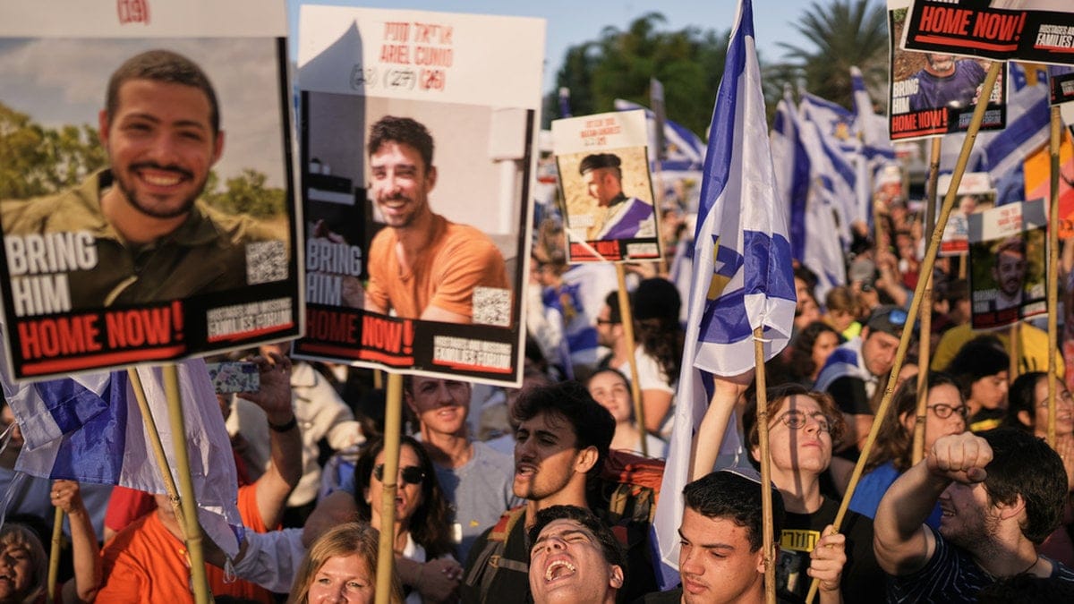 Bilder därifrån visar hur anhöriga – många tårögda, vissa leende – håller upp israeliska flaggor och bilder på gisslan.