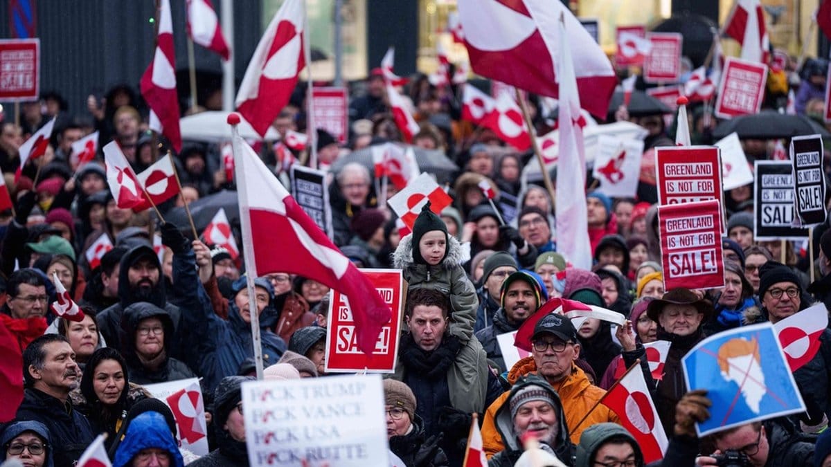 "Grönland är inte till salu". En protest i Nuuk efter att USA:s president Donald Trump framfört aggressiva utspel om att hans land "behöver" den självstyrande danska ön. Foto: Evgeniy Maloletka/AP/TT
