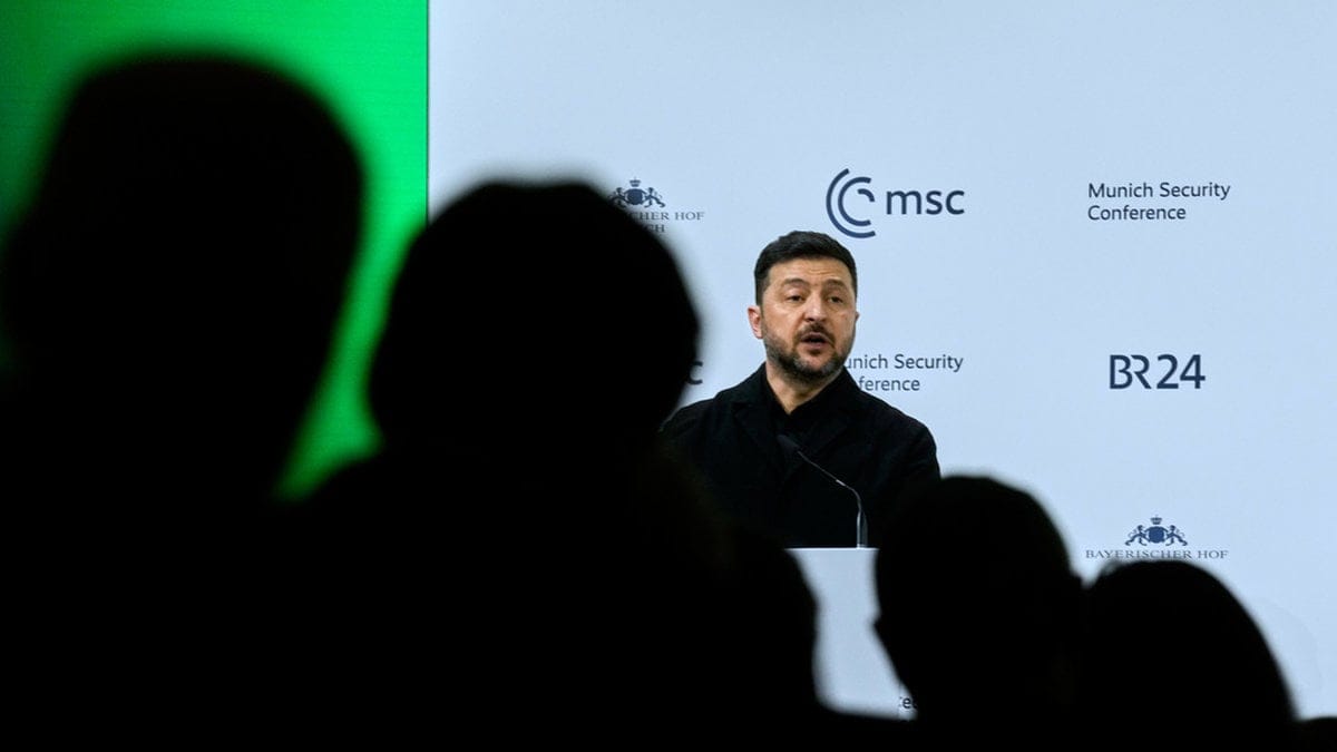 Innan Zelenskyj hunnit börja tala möts han av stående ovationer. Han tackar för omvärldens stöd, och nämner speciellt initiativet Purl, där övriga Nato-länder handlar vapen av USA för att ge till Ukraina.