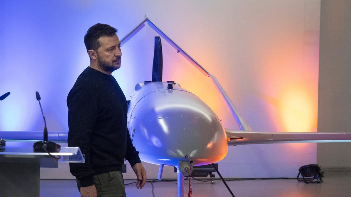 Volodymyr Zelenskyj framför en militär drönare, framtagen i samarbete med Danmark. Bilden är tagen i Kiev i slutet av 2024. Foto: Efrem Lukatsky/AP/TT