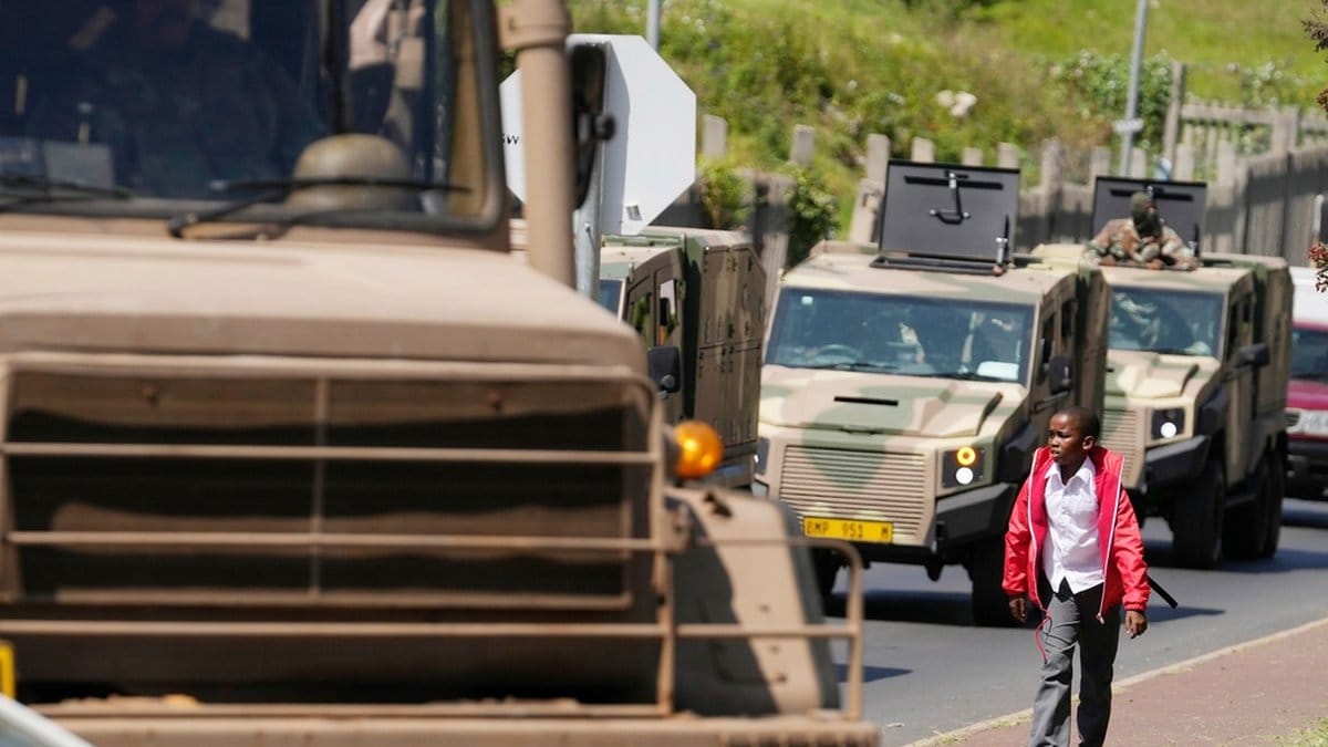 Ett tiotal bepansrade fordon rullar på onsdagen genom Johannesburgförorten Riverlea, som länge plågats av gängvåld och brottslighet kopplad till illegal gruvdrift.