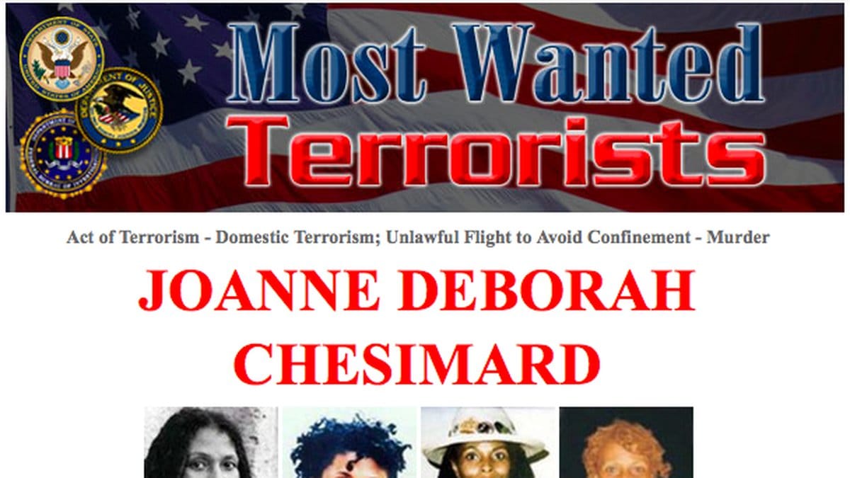 Joanne Chesimard sköt ihjäl en polis 1973 och dömdes 1977 till livstids fängelse. Två år senare flydde hon och har sen dess varit på rymmen. Enligt Businessweek levde hon under ytan de första fem åren innan hon flydde till Kuba 1984. Nu blir hon den första kvinnan att ta plats på FBI:s lista över mest eftersökta terrorister.