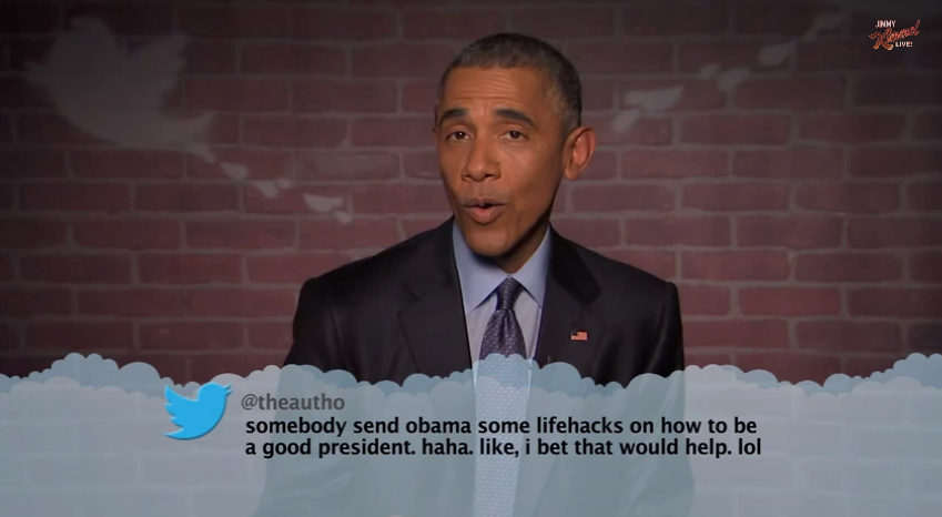 Nu dyker han också upp hos Jimmy Kimmel – och får liksom många andra gäster läsa upp taskiga tweets om sig själv.