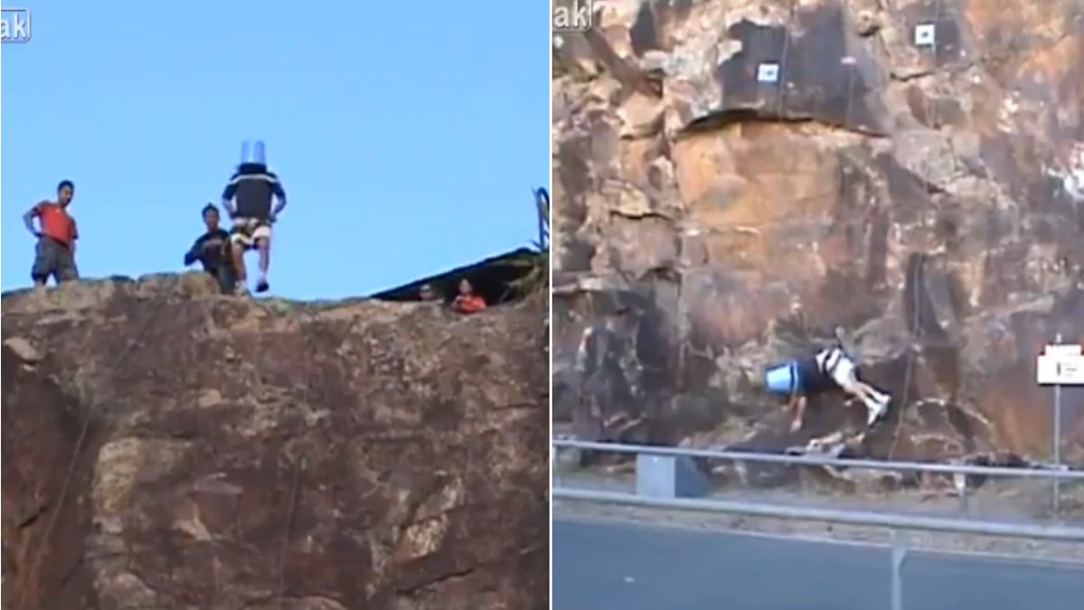 Hoppar bungyjump – med hemmagjort rep och hink på huvudet