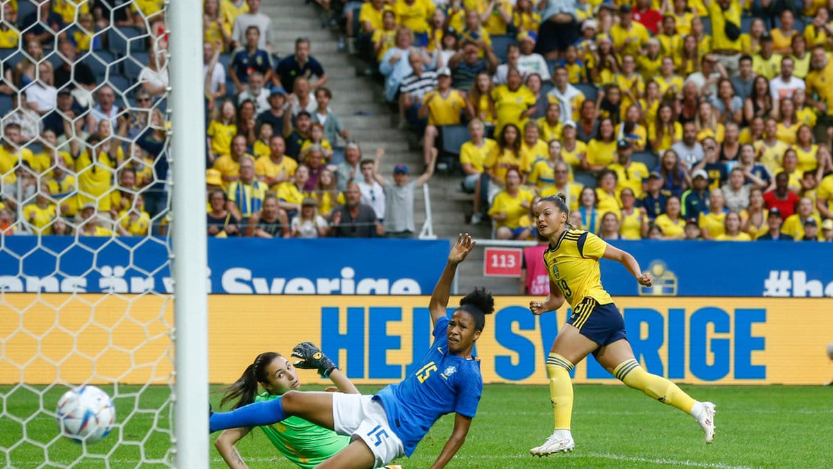 Målet var tjusigt. En brasiliansk försvarare nickade bort bollen från straffområdet, men den landade framför Rytting Kaneryd som ropade åt Filippa Angeldahl att hålla sig undan. Sedan dribblade hon bort ett par motståndare och satte bollen i det bortre hörnet.
