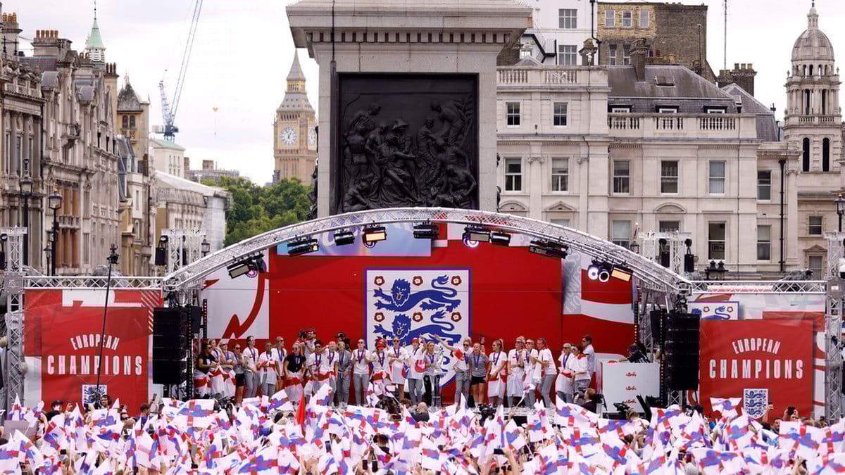 Under söndagskvällen vann England EM-finalen mot Tyskland med 2–1 efter förlängning. Tusentals människor samlades på måndagen på Trafalgar Square i centrala London för att visa sin uppskattning.