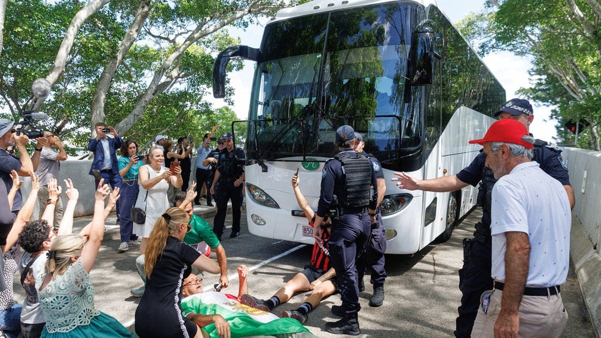 Tidigare under tisdagen rapporterades det att demonstranter försökt stoppa den iranska spelarbussen vid hotellet på Guldkusten genom att bland annat lägga sig framför fordonet innan avresan mot den lokala flygplatsen.
