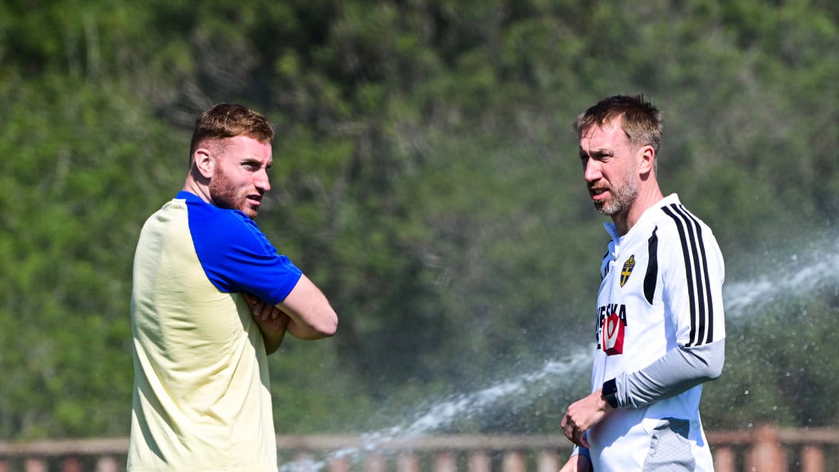 Den 26-åriga stjärnan dök upp på Blågults sista träning inför Sveriges VM-playoffsemifinal mot Ukraina i kväll.